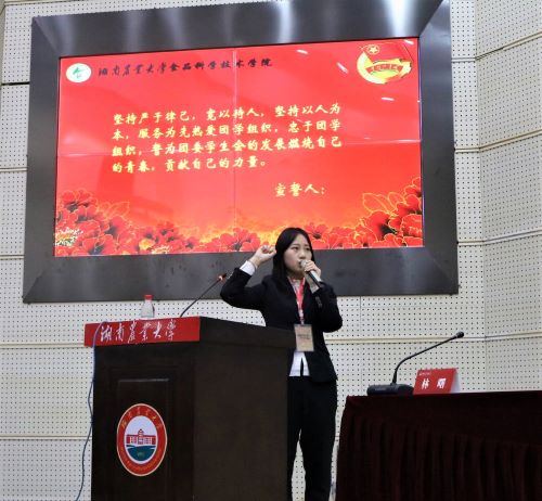 随后,食科院第二十六届团委学生会学生事务中心主任兼执行主席赵烨鹏作任职发言。他明确了作为执行主席的工作要点,其中,服务意识、综合素质、团队建设是重中之重。第十七届研究生团总支副书记张玉作任职发言。她表态:“研究生会的同学们要秉承服务意识,助力学院发展;精诚合作,集体砥砺奋进让团队做到最好;提升综合素质,提高业务能力为今后奠定基础。”